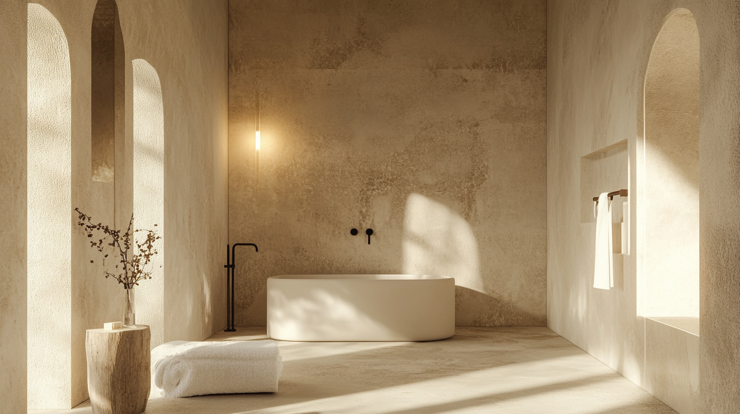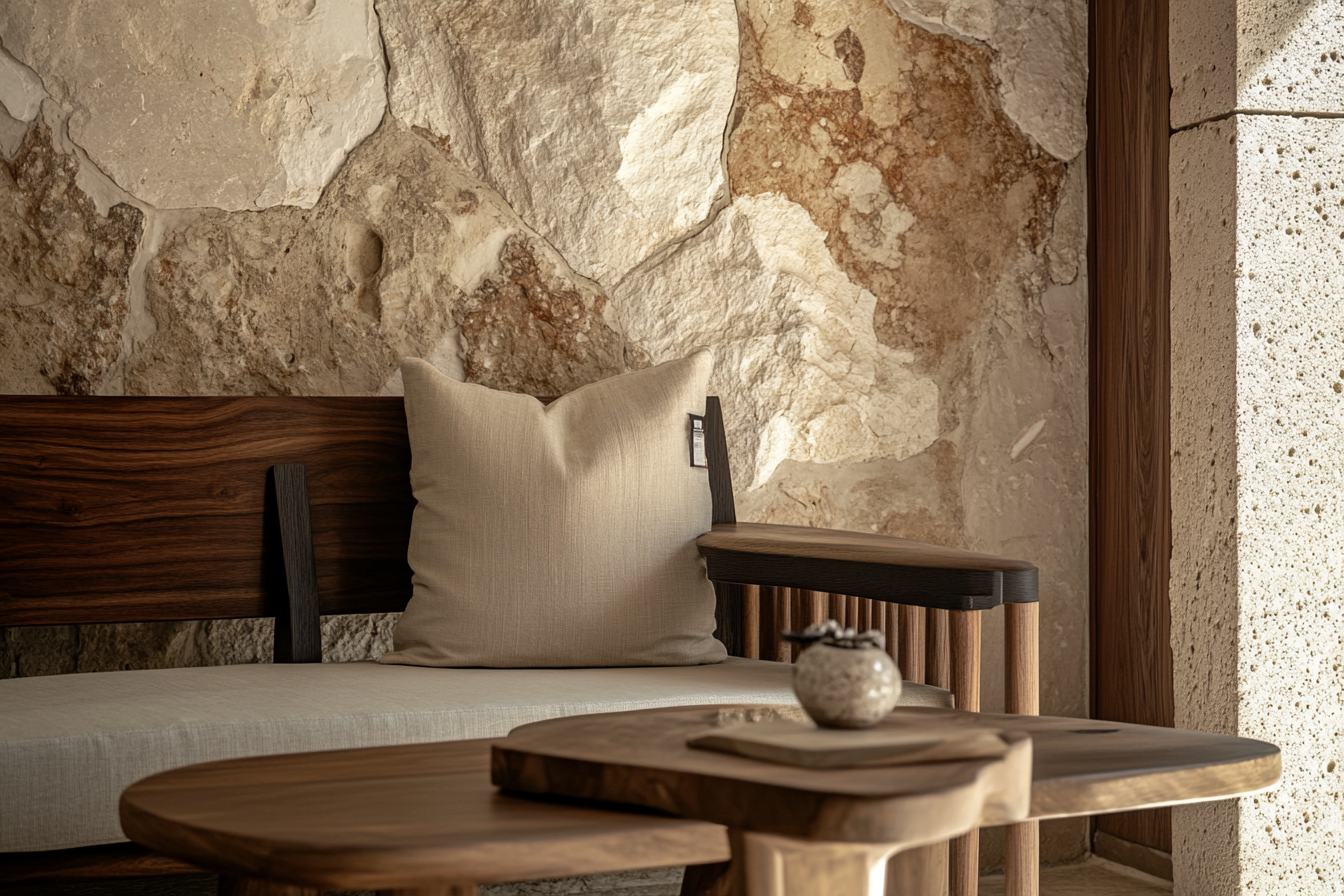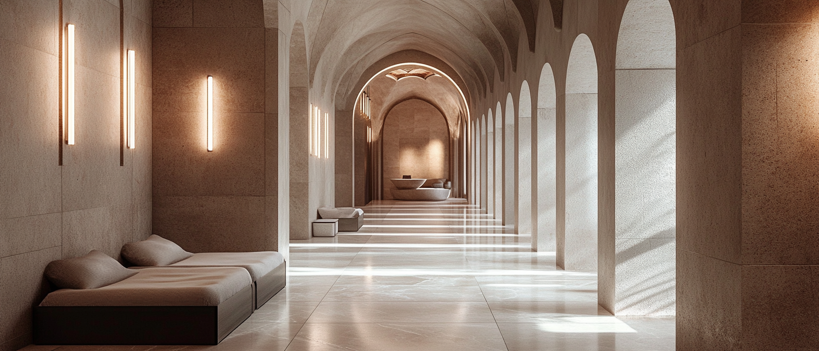 Generous volumes, sculptural arches, and tactile stone surfaces recall the nobility of historic Milanese palazzi.
